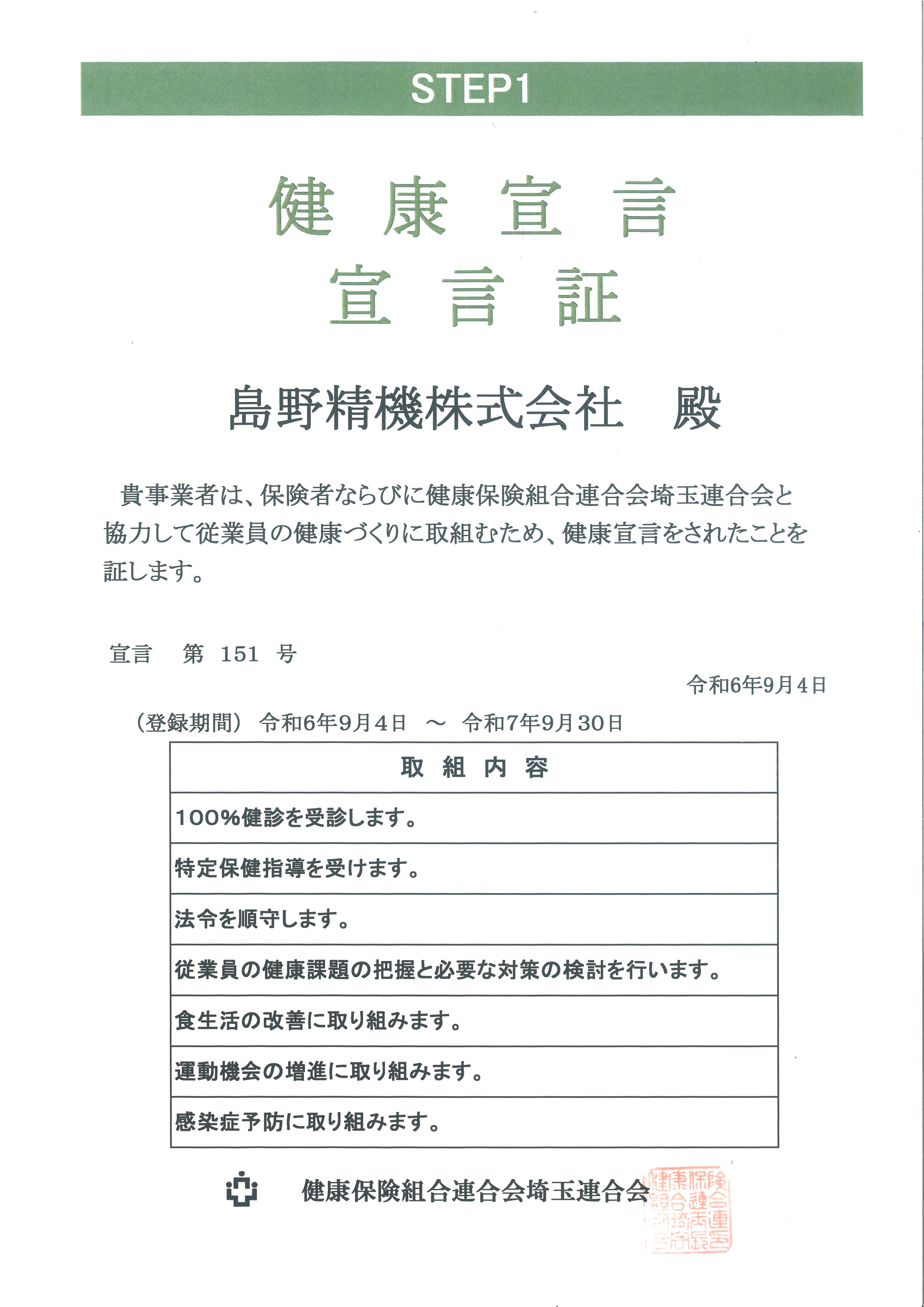 | より良い職場環境の整備に取り組んでいきたいと考え、「健康宣言」を行い『健康宣言の宣言証』を取得しました。 |
